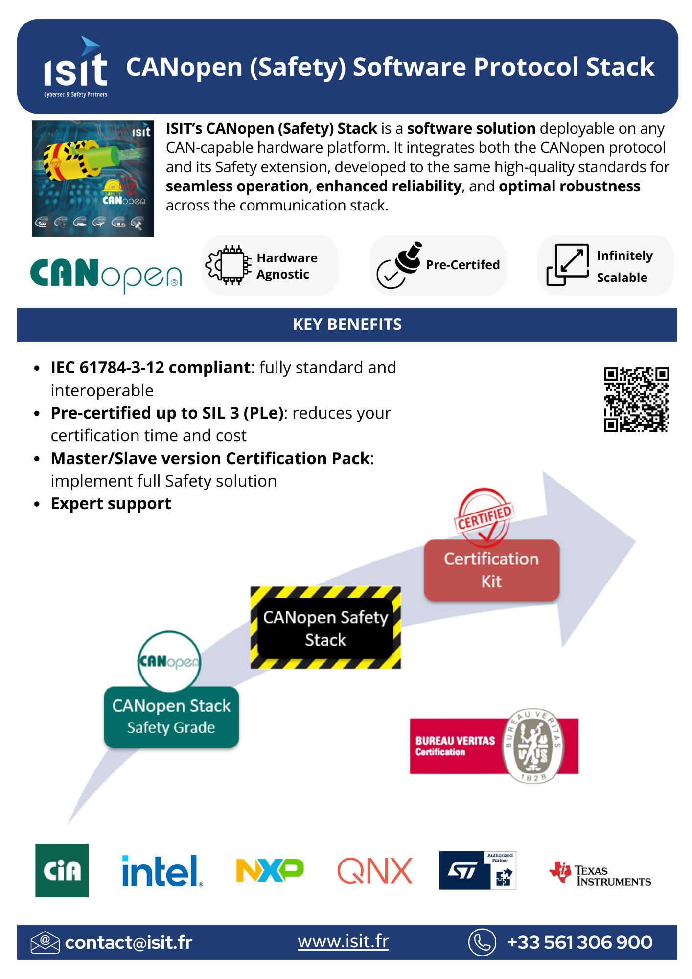 For applications requiring compliance with official safety standards (IEC 61508, ISO 13849, ISO 25119, DO-178, or ECSS-E-ST-50-15C), ISIT also provides a Certified CANopen Safety Stack, ensuring certification-readiness with supporting documentation and test assets.